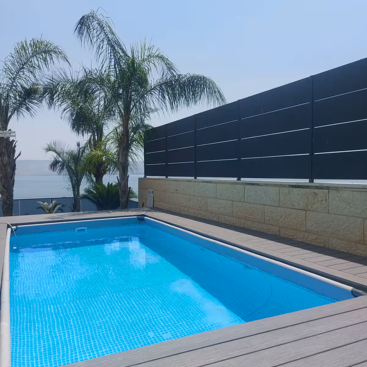 חצר ענקית נוף מלא לים מכל שטח החצר, בחצר ישנם בריכה, גריל גז, מקומות ישיבה, מיטות שיזוף, ועוד.